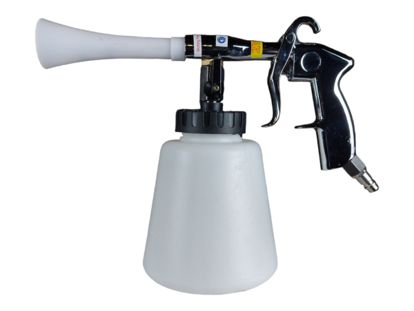 Многофункциональный чистящий пистолет оснащен гибкой трубкой малого диаметра, вращающейся посредством сжатого воздуха, через которую распыляется моющая жидкость, что позволяет быстро удалять загрязнения различного происхождения с ткани, велюра, винила, пластика и других материалов. Под давлением компрессора жидкость смешивается с воздухом, образуя вихрь с быстрыми оборотами, выдавая что-то вроде небольшого торнадо.